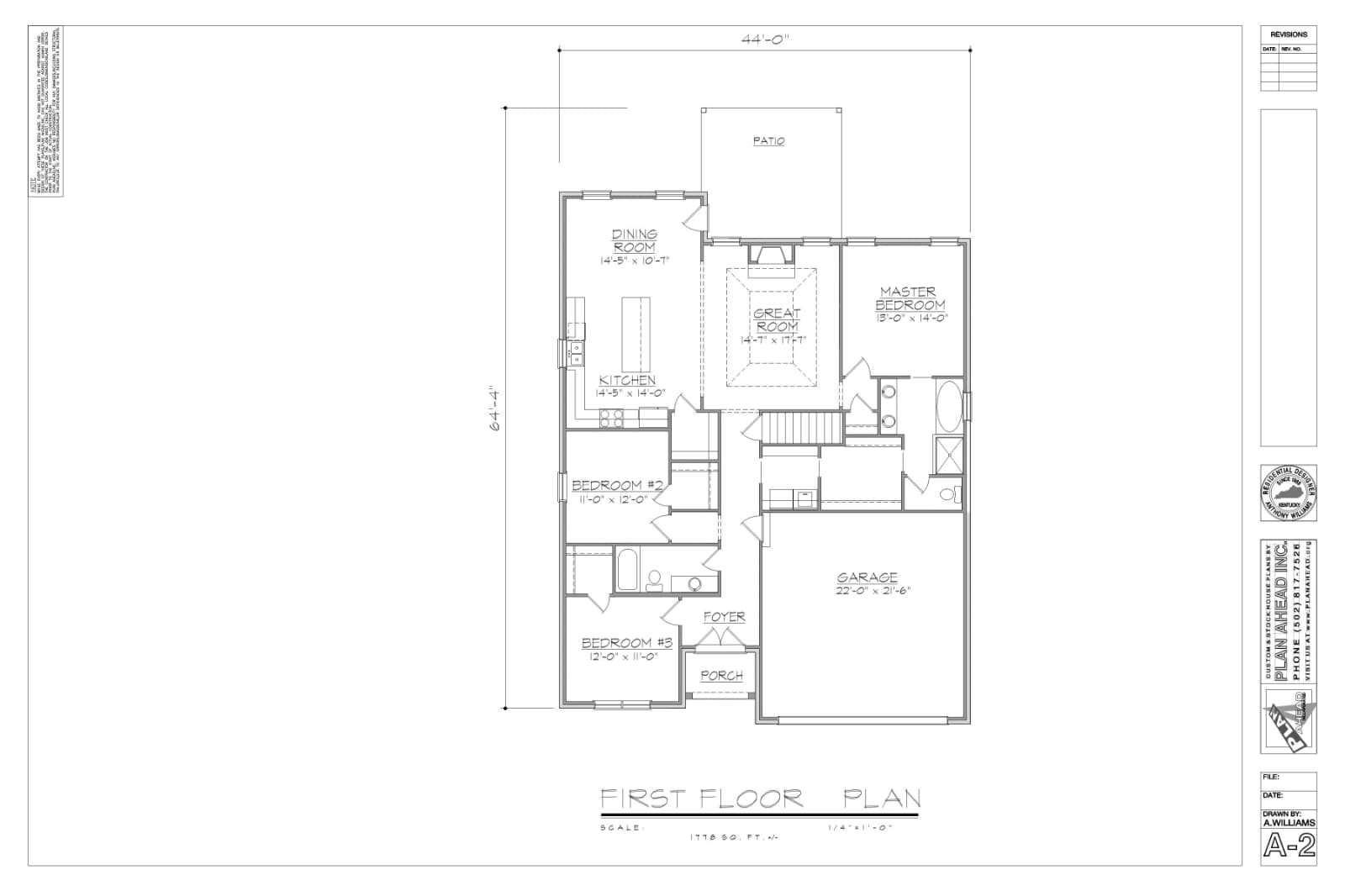 Square footage 1778 Square Feet Width 44’-0″ Depth 64′-4″ Foundation Slab
